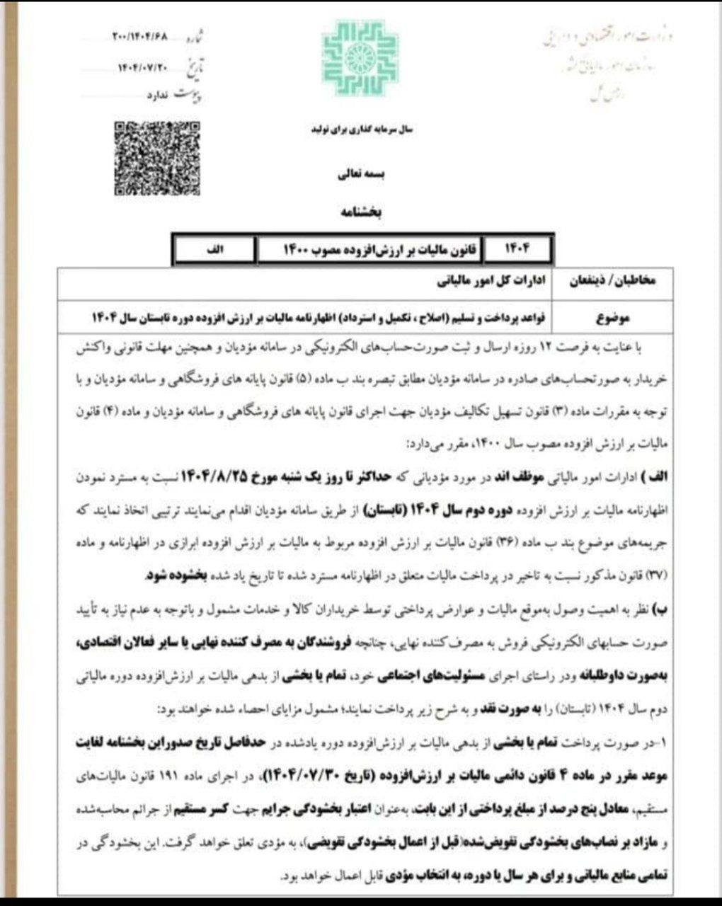 🟩 بخشنامه جدید تمدید مهلت اظهارنامه مالیات بر ارزش افزوده تابستان ۱۴۰۴