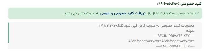 کلید خصوصی (Private Key): این بخش در اختیار شما قرار میگیرد و شما با آن امضا تولید میکنید (یا سامانه تولید و در اختیار شما قرار میدهد) تا ارتباط بین شما و سامانه رسمی حفظ شود.