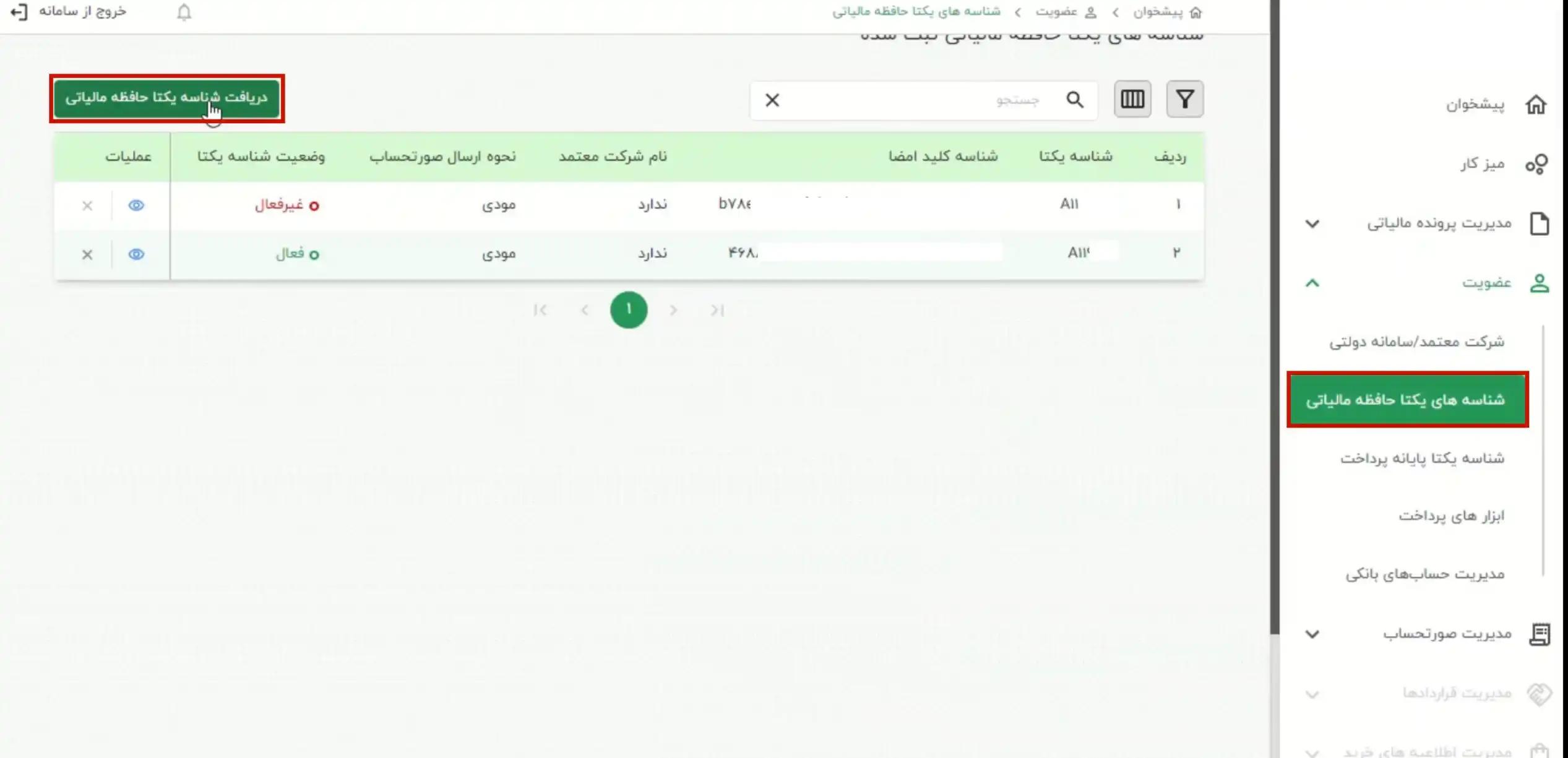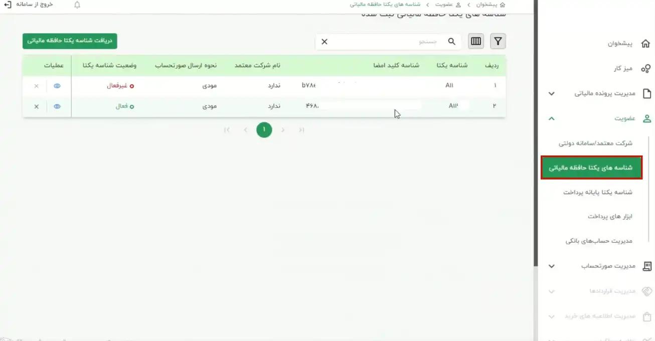 از بخش عضویت گزینه شناسه یکتا حافظه مالیاتی را انتخاب کنید.