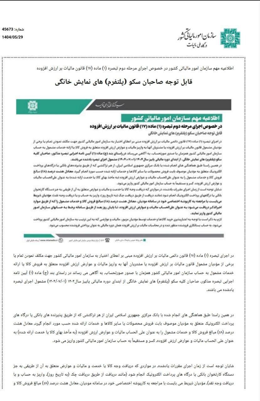 سازمان امور مالیاتی کشور در راستای اجرای مرحله دوم تبصره (۱) ماده (۱۷) قانون مالیات بر ارزش افزوده، اطلاعیهای مهم خطاب به صاحبان سکوهای نمایش خانگی (پلتفرمها) صادر کرده است. بر اساس این اطلاعیه، از ابتدای دوره مالیاتی زمستان سال 1404، کلیه تراکنشهای مالی مربوط به خرید خدمات یا کالا از طریق این پلتفرمها مشمول مالیات و عوارض ارزش افزوده میشوند.